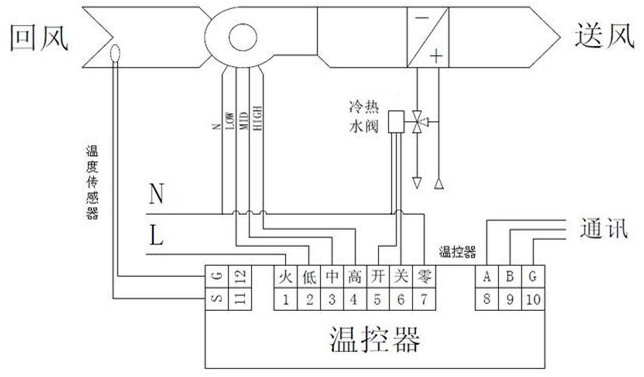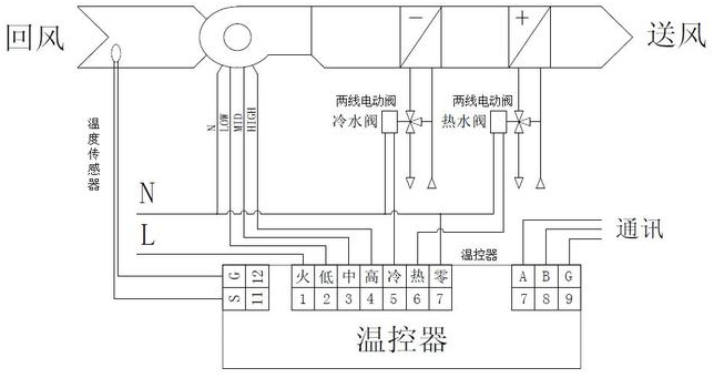 四管系統包括兩個獨立的冷卻水和熱水熱交換裝置。冷水閥系統打開用于冷卻,熱水閥系統打開用于加熱。溫度控制器實時檢測室溫并將其與設定溫度進行比較,根據比較結果控制電動閥的開關,從而保持室溫處于穩態。