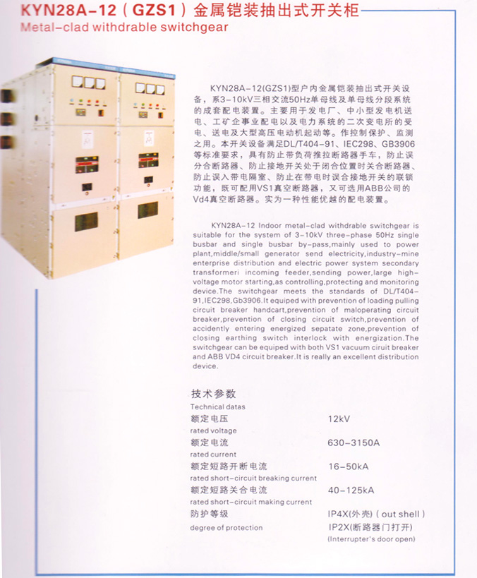 KYN28A-12(GZS1)金屬鎧裝抽出式開關柜